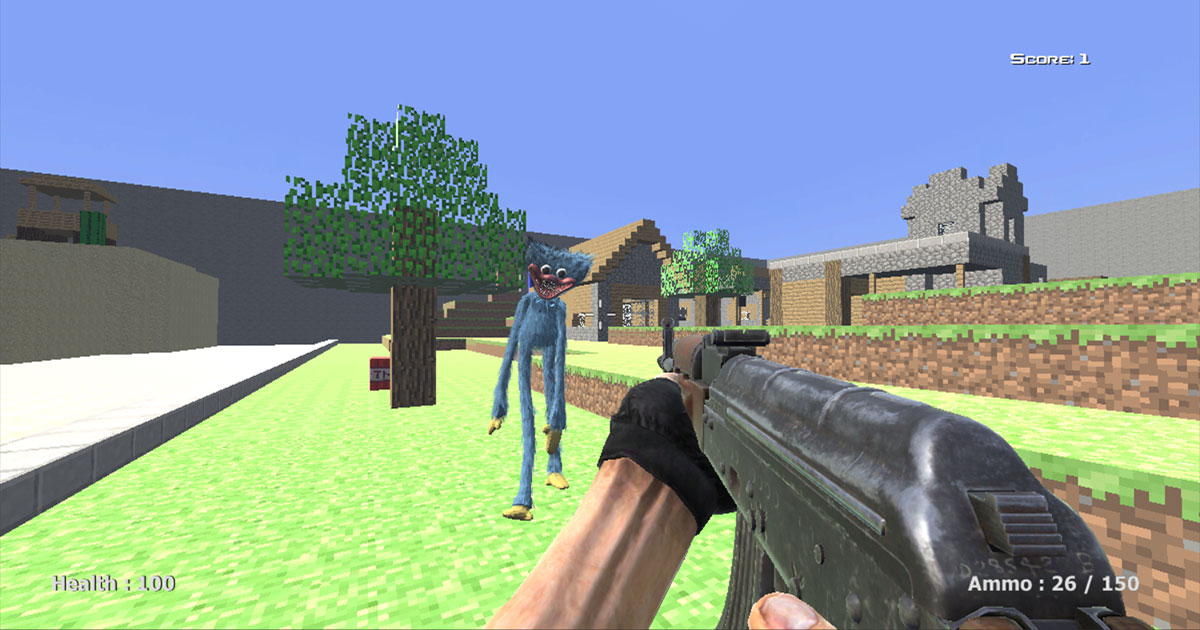 Poppy Strike 2 features big arsenal of weapons and minecraft themed map where your mission is to shoot all incoming huggy wuggy dolls and try to survive each round in order to win and unlock new guns.